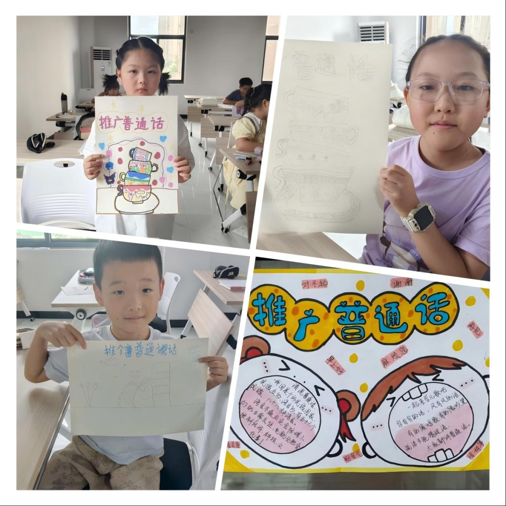 志愿者们借助暑托班的绘画课程,别出心裁地组织孩子们开展了推广普通话手抄报绘画活动。当志愿者们讲解完活动主题和要求后,孩子们纷纷拿起画笔,发挥自己的想象力和创造力,将对普通话的理解、喜爱以及推广普通话的想法融入到画作之中。有的孩子画了一群小伙伴围在一起用普通话交流的场景,有的孩子则在手抄报上写下了“说好普通话,方便你我他”的标语,还有的孩子用五彩斑斓的颜色勾勒出“普通话”三个字的艺术造型。活动得到了孩子们的热烈响应和积极参与,共收到了20余份充满童趣与创意的作品。志愿者们将这些作品一一拍照,发送到了家长群内,家长们看到孩子们的作品后,纷纷在群里点赞、评论,分享着孩子们的成长与进步,也深切感受到了孩子们对普通话的热情与喜爱。