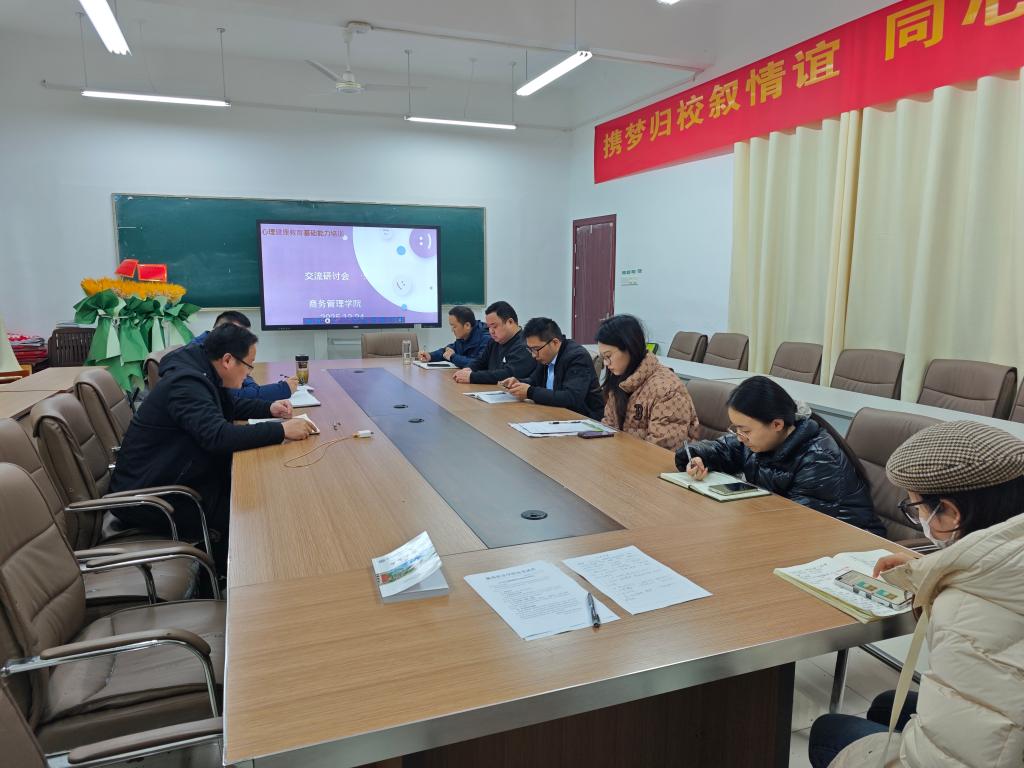 为进一步强化学院心理健康教育工作队伍建设,提升专兼职辅导员心理健康教育专业素养与实操能力,切实筑牢学生心理健康防线,12月24日上午,商务管理学院组织召开心理健康教育基础能力培训研讨会。会议围绕心理健康教育培训核心知识技巧、优秀经验方法及典型案例展开深入交流探讨,学院全体专兼职辅导员参会,会议由鲍骏主持。