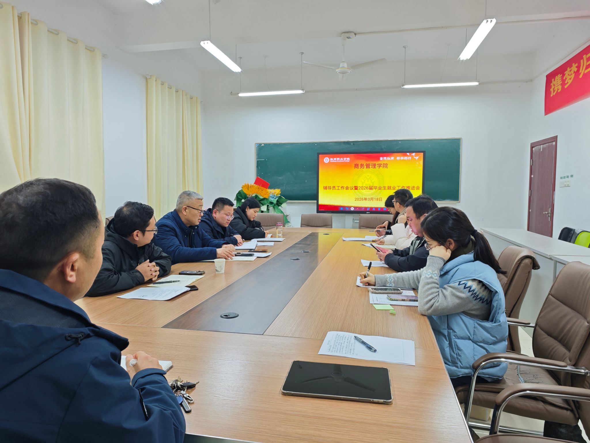 3月18日下午,商务管理学院在槽郢校区会议室召开学生工作会议暨2026届毕业生就业工作推进会。学院党总支书记孙华、党总支副书记鲍骏、副院长汪红蕾、团总支书记李文、学工干事和全体专兼职辅导员参加会议,招生就业办主要负责人惠光伦应邀出席会议,会议由鲍骏主持。