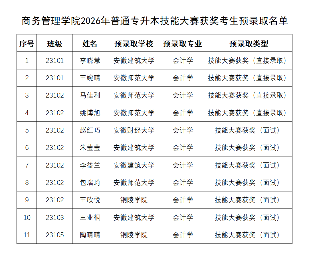 近日,安徽省2026年普通专升本技能大赛获奖考生免试预录取工作圆满结束。商务管理学院11名学子凭借省级及以上职业技能大赛优异成绩,顺利通过安徽建筑大学、安徽师范大学、安徽财经大学、铜陵学院等省内重点本科院校资格审核与面试考核,成功获得预录取资格,充分彰显学院“以赛促学、以赛促升学”的育人成效。