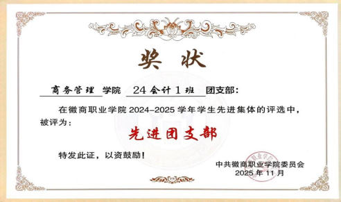 商务管理学院24会计1班团支部凭借扎实的思想建设、优良的学风氛围、丰富的实践活动与强大的集体凝聚力,经学校严格评审,成功获评2024-2025年度校级“先进团支部”。这份荣誉既是对团支部全体成员辛勤付出的肯定,更是对未来继续砥砺前行的鞭策。